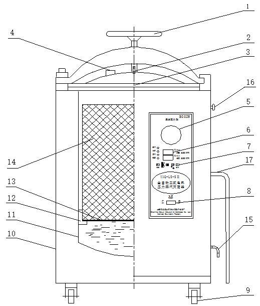 1、旋轉(zhuǎn)手輪(1)拉開桶蓋(3)取出滅菌網(wǎng)籃(14)取出擋水板(13)。