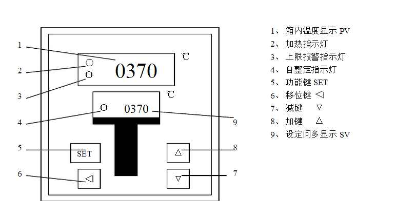 6.如使用定時(shí)功能時(shí),只有**次PV>SV時(shí),即箱內(nèi)溫度高于設(shè)定溫度時(shí),定時(shí)器開始工作(采用倒計(jì)時(shí)),同事SV數(shù)碼末位上的一位小數(shù)點(diǎn)閃爍。定時(shí)結(jié)束,SV顯示End,末位小數(shù)點(diǎn)熄滅,同時(shí)切斷加熱器電源。