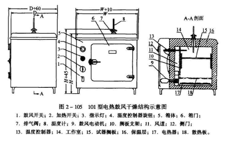 101型鼓風(fēng)干燥箱內(nèi)裝有鼓風(fēng)機(jī),工作室內(nèi)空氣借鼓風(fēng)機(jī)促成機(jī)械對(duì)流。開啟排氣閥門可使工作室內(nèi)之空氣得以更換,獲得干燥效果,溫度用儀表進(jìn)行自動(dòng)控溫,控溫儀、繼電器及全部電氣控制設(shè)備均裝于箱側(cè)控制層內(nèi),控制層有側(cè)門可以卸下,以備檢察或修理線路時(shí)用。