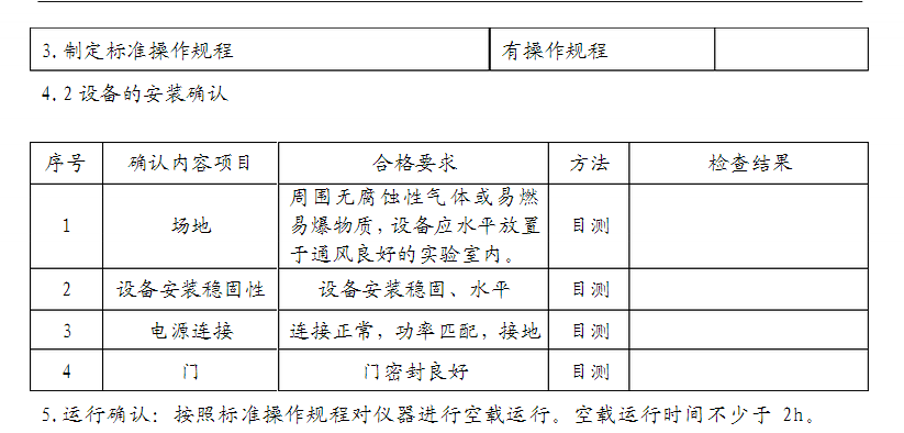 2.驗證目的:通過對設(shè)備資料檢查,運(yùn)行、性能的確認(rèn),確保儀器的相關(guān)資料的齊全、完整,各項性能穩(wěn)定,從而保證檢驗的準(zhǔn)確、可靠。 3.驗證依據(jù):???? 4.設(shè)備的預(yù)確認(rèn) 4.1操作規(guī)程等資料確認(rèn)