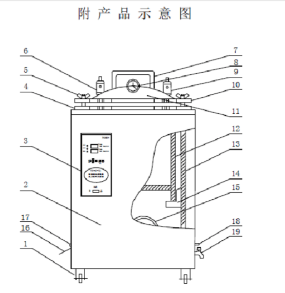 5.當滅菌器工作時,容器內(nèi)缺水時,有聲光報警;當滅菌器工作結(jié)束后, 有聲音提示。 6.對不同類型,不同滅菌要求的物品,如敷料和液體等,切勿放在一起滅菌,以免顧此失彼,造成損失。 7.滅菌結(jié)束時,壓力表指針必須恢復零位,將放汽閥搭子置于放汽方位。使外界空氣進入滅菌器內(nèi),真空消除后,容器蓋即可開啟。 8.本設備配件除熔斷器外如需更換,只能更換由廠家提供的零配件且應在廠家指導下或由廠家授權(quán)的人員更換。 9.平時應用潔布擦拭設備,保持設備的清潔和干燥,以延長設備使用年限。